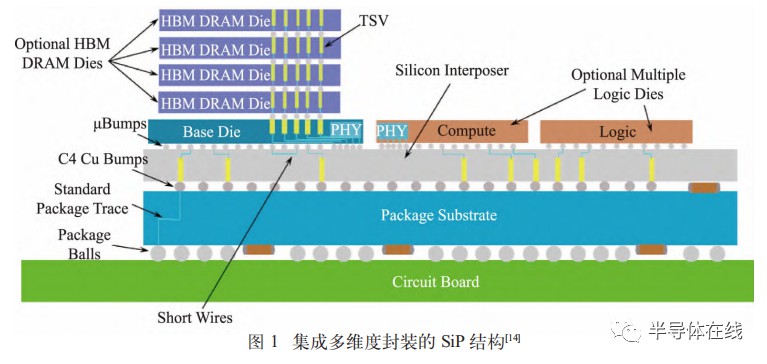 随着高端性能封装技术的发展,不同维度封装结 构间的界限将变得模糊,将其集合成一个系统的 SiP 会变得普遍,图 1 为集成多维度封装的 SiP 结构示意 图。例如 Intel 的最新产品 Ponte Vecchio 集成了嵌入 式多芯片互连桥接技术(EMIB)和逻辑晶圆 3D 堆叠 技术(Foveros);TSMC 的 SoIC 也可与 CoWoS 和集成 扇出型叠层封装(InFO-PoP)相结合并共同使用。上述 结构可以实现器件对性能的极致追求,同时,多颗处 理芯片的集成也为器件的热耗散带来巨大挑战。