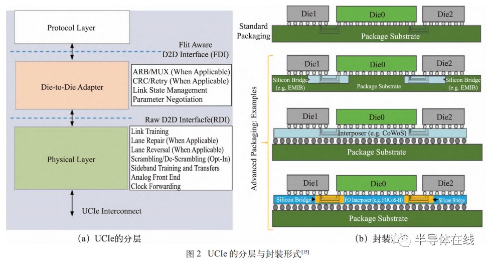 在高端性能封装结构中,多颗特定功能的芯片(Die)被集成在单个系统之中,上述芯片的连接已成为 迫切需要解决的问题。Intel 公司开发了一种开放性的 通用小芯片互连技术(UCIe),为异构的小芯片间提供 了高带宽、低延迟、高电源效率和高性价比的封装连接。该标准结合外围元器件互连总线标准(PCIe)、计 算链接协议(CXL)和软件基础设施来确保互操作性, 使得设计者能够对不同来源的芯片进行封装,UCIe 的 分层与封装形式如图 2 所示。