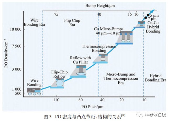 I/O 密度与凸点节距、结构的关系如图 3 所示,传 统的可控塌陷芯片连接焊球已无法满足高端性能封 装对高密度 I/O 的要求,取而代之的是节距小于 100μm 的微凸点。目前,常用的微凸点连接结构有铜-锡-铜、 镍-锡-镍、铜-锡-镍、铜-镍-锡-镍-铜和铜-铜。在 热压键合工艺中,微凸点的最小节距甚至可以缩小至 10 μm,混合键合工艺又使凸点节距小于 10 μm。除 晶圆间的混合键合外,C2C 和 C2W 混合键合技术在 近年来受到青睐。除可获得最优的电性能外,该技术 可选择已知合格芯片进行贴片,以提升整体良率,降 低制造成本。由于 C2C 和 C2W 混合技术涉及晶圆切 割,如何保护化学机械抛光后的芯片表面免受污染、 同时提升键合界面的强度问题仍需解决。已有的报道 在切割过程中采用光刻胶遮住芯片表面,再采用等离 子体进行后处理,产品的封装良率尚无法满足工业批 量生产的要求,上述问题有待更多的研究。
