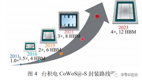 无机中介层包括硅桥、硅转接板和玻璃转接板。在高带宽存储芯片和处理芯片间,存在局部的高密度 连接。Intel 根据上述结构特点,开发出硅桥结构,将其 埋入基板,仅连接高密度 I/O 部分,其余的布线连接由基板完成。部分企业则将硅桥与 FO 封装相结合,开 发出新的封装结构。据日月光的报道,与布线宽度 / 间 距为 0.8 μm /0.8 μm 的 2.5D 封装相比,采用布线线宽/ 间距为 2 μm /2 μm 的嵌入硅桥的扇出型基板上芯片 封装(FOCoS-B)表现出更优的电性能。在 2.5D 封装 中,硅转接板为芯片平面互连提供了媒介。台积电 CoWoS@-S 封装路线如图 4 所示,按照 TSMC 推出的 存储芯片与逻辑芯片的组合方式,2023 年硅转接板的 平面面积将达到 2011 年转接板面积的 4 倍,如何将大 尺寸的转接板贴在基板之上而无贴片偏移和虚焊等 问题尚待解决。另外,硅作为一种半导体材料,不利 于信号的传输与完整性保持。TSMC 通过在硅转接板 上制作电容以弥补上述不足,但金属布线形成的电容 容量有限,无法满足广泛的应用需求。近年来,有学 者提出采用绝缘材料如玻璃替换硅,而在玻璃转接板 上制作多层亚微米级布线并提高集成度仍需要进一步探索。