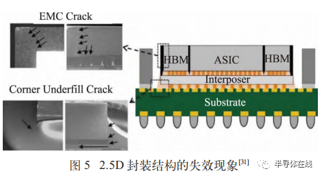 在高端性能封装中,芯片主材硅、金属和高分子 材料间的热失配问题普遍存在,由此导致封装结构在 边角处出现焊球疲劳、模塑料开裂和底填料界面分层 等现象,2.5D 封装结构的失效现象如图 5 所示。在 上述问题中,FO 封装在降低焊球热疲劳方面具有优势,大量的模塑料使得结构的热膨胀系数增大至接近 基板的水平,两者在热胀冷缩过程中保持协调变形, 焊球的应力降低,使得结构在可靠性测试时表现良好。同时,模塑料的比重小,降低了焊球在振动与跌 落过程中的惯性,有助于封装结构在上述测试时保持 完整。相比于 FO 封装,2.5D 和 3D 封装的叠层结构自 身比重大,不仅不利于散热,而且其与基板间协调变 形的难度增加了,不断增大的 2.5D 硅转接板尺寸加剧 了该现象。此外,采用模塑料对 FO、2.5D 和 3D 封装产 品进行外保护,硅芯片与模塑料间会由于热失配导致 模塑料开裂,事先使用有限元工具对模塑料的材料进 行选择是一种合适的解决方案。