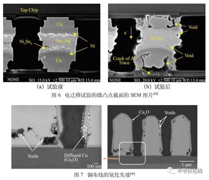 与微凸点的热电迁移相似,处理芯片与高带宽存 储芯片间的高密度布线亦存在上述问题,且处理芯片 工作时温度高达 100 ℃,其与存储芯片间的温度梯度 加速了上述现象的发生。在 FO 封装中,金属铜布线被 包裹在高分子钝化层中,使得其表面发生氧化、生成 氧化铜,铜布线的氧化失效如图 7 所示。在铜氧化的 过程中,铜不断向表面迁移,使得铜与氧化铜界面处 存在大量孔洞。在高温和大电流的作用下,上述氧化 现象更加明显,形成的大量孔洞严重影响布线强度与信号传输。一些研究采用非有机材料在铜表面形成保护层,将铜与高分子材料隔离,防止其氧化,由此导致 的新工艺增加了额外的制造成本。