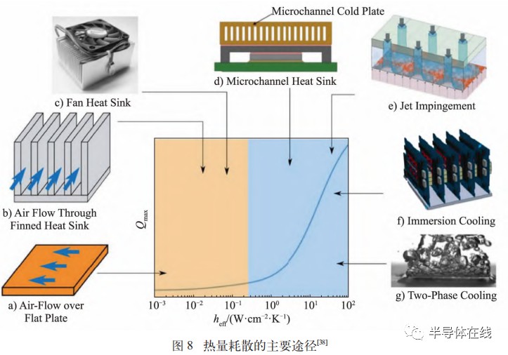 为追求最优的计算性能,处理芯片的技术节点不 断向前推进,集成的晶体管数量激增,与此同时,封装 的集成度进一步提高,要求封装体能够为处理芯片提 供热流密度高达 1 000 W/cm2的热量耗散能力。在高 端性能封装中,UHD FO、2.5D 和 3D 封装最终与基板贴合 , 一 般的组装 方 式 为 倒 装 芯 片 球 栅 阵 列 (FCBGA)。该封装的主要散热途径为背部热沉,一些 学者通过优化其设计,采用水冷、气液 2 相、风冷等方 式进行散热,优化结构的最大热耗散功率(Qmax)与有 效传热系数(heff)间的关系,以满足不同产品的应用需 求,热量耗散的主要途径如图 8 所示。